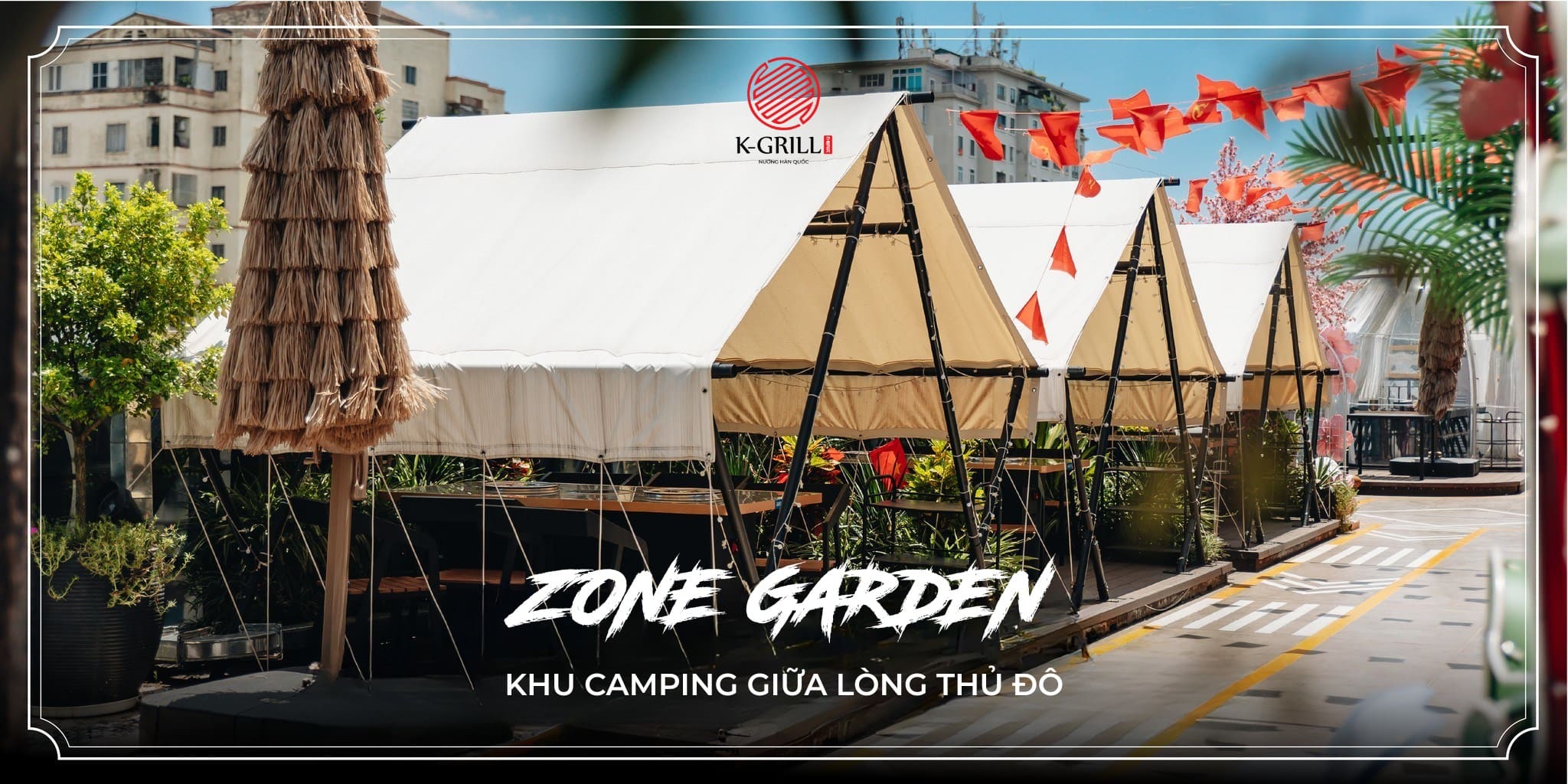 Zone Garden tại K-grill chính là “ốc đảo” ấy. Ở đây, bạn sẽ được bước vào không gian camping với những mái lều trắng tinh khôi, view cao thoáng đãng, gió trời mát rượi và ánh đèn lung linh khi đêm xuống.